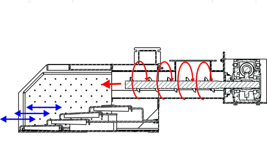 Paliwo podawane oddzielnym - niezależnym od głównego podajnikiem śrubowym przesuwane jest do paleniska. Podłoga palnika wykonana z żeliwnych sztabek jest ruchoma, co umożliwia przesuwanie się paliwa i żaru w głąb paleniska kotła. Po odpowiednio dobranym czasie przebywania biomasy w palniku, zostaje ona spalona i dopalona całkowicie a popioł samoistnie spada do popielnika.